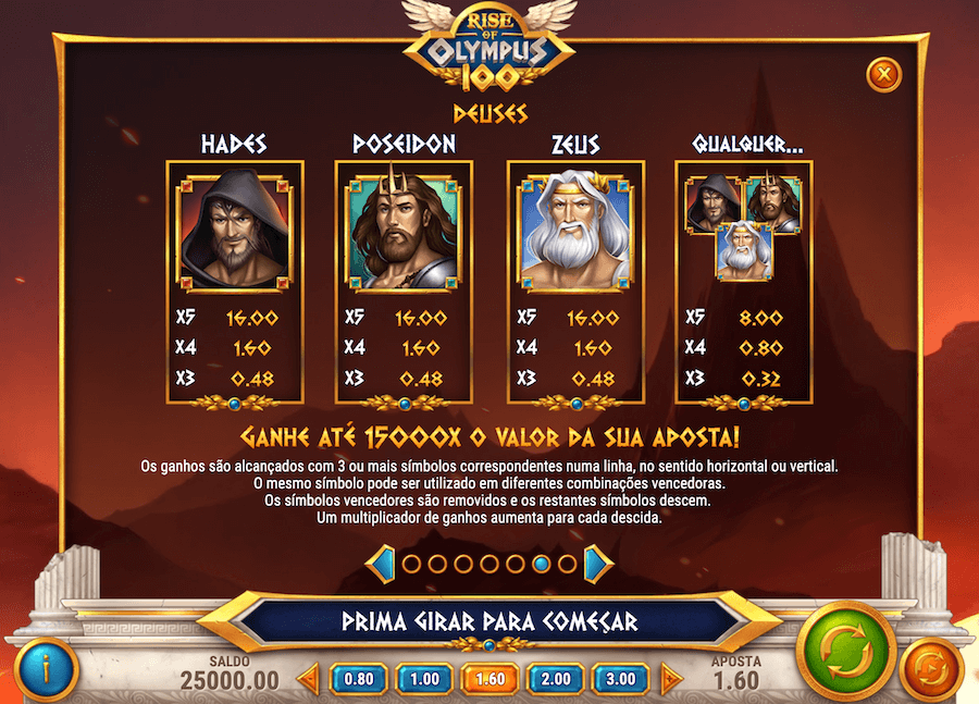 Veja na tabela abaixo os principais recursos presentes no Rise of Olympus 100 slot: